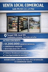Venta Local Comercial – San Pedro de la Paz Se vende local comercial con contrato de arriendo vigente, ubicado en Tucapel 50B, Condominio Costamar, San Pedro de la Paz. El inmueble se encuentra en buen estado y operativo, ideal para minimarket, rotisería, venta de abarrotes, frutas, verduras, productos congelados, bazar o comercio similar. Renta mensual de 1.200.000 clp, con reajuste por IPC. Ubicado en un entorno residencial consolidado con buena conectividad y flujo de potenciales clientes, lo que lo convierte en una excelente oportunidad para desarrollar o invertir en un negocio. Interesados, contactar para más información o coordinar visita.
